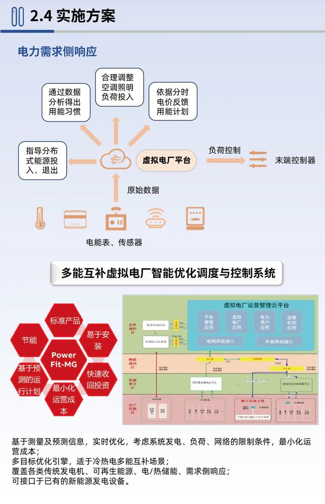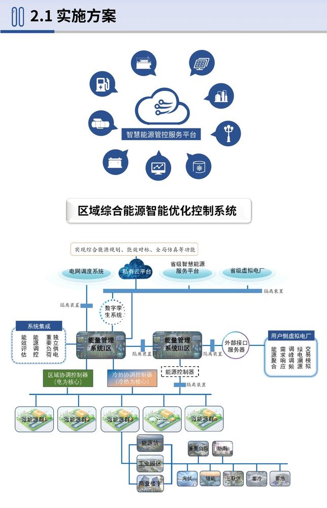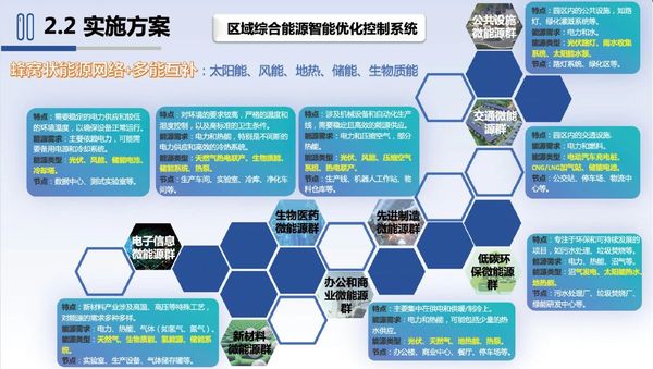 国孚电力“源网荷储” 微能源系统方案 中德生态园多能互补综合能源零碳园区 示范项目 由国孚电力总体规划和设计的《国网青岛中德生态园多能互补综合能源零碳园区示范项目》作为多能服务新兴业务试验示范项目,列入国网公司推进2019-2020年综合能源服务业务发展行动计划,是国家电网第一批综合能源类重点科技指南项目的依托工程,是2019年山东省重点研发计划示范项目。本项目应用多能互补综合能源系统协同优化规划技术、智能调控技术、全自主供电技术、绿电直连技术、能效评估及提升技术、区块链技术、虚拟电厂技术、基于实时仿真的多能互补综合能源数字孪生技术,将风、光、气、储、地热等多种分布式能源以信息网及电/热力网络的方式进行高效互联,实现区域综合能源效率最大、冷热电负荷就地平衡调节、综合能源高可靠供给以及供能的经济合理,向示范区用户提供开放共享、灵活智能、绿色协调、经济可靠的综合能源供应、资产运营管理及增值服务,探索综合能源系统市场化商业运营模式,打造可复制、可推广的世界一流能源互联网示范工程。