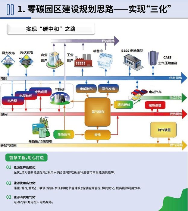 国孚电力 “零碳园区建设”大讲堂 第2期发表时间:2025-08-12 13:51 如何进行零碳园区建设” 建设零碳园区需要构建 “源网荷储” 微能源网系统,综合运用多种技术手段:通过发展太阳能、风能等新能源实现能源生产低碳化,利用储能、蓄能、余热余压回收等提升能源使用效率,推广电动汽车、电热泵、蓄热式电锅炉等促进能源消费电气化;同时借助智慧能源管控平台优化能源调度,推动光伏建筑一体化、光储充检一体化等项目,构建资源循环利用体系,最终实现碳排放与吸收平衡。